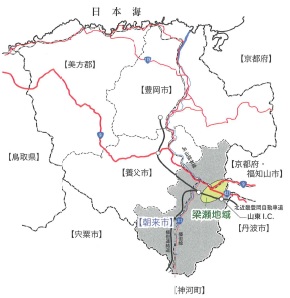 梁瀬地域は、兵庫県北部に位置する但馬地域の玄関口にあたる朝来市山東町にあります。周囲を山々に囲まれた山東盆地に位置し、町の中央部を円山川の支流、与布土川と粟鹿山から流れ出る粟鹿川、さらに京都府との県境、夜久野高原から流れる磯部川が梁瀬地域の中心である矢名瀬で合流し、円山川へと流れています。